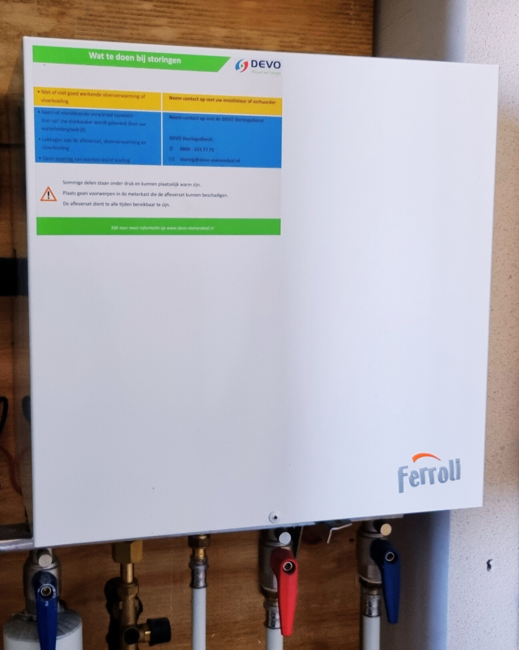 Goed om te weten: Het verwarmings- en koelingssysteem in je woning (bijvoorbeeld de vloerverwarming) wordt niet aangelegd door DEVO. Deze valt onder de verantwoordelijkheid van de ontwikkelaar, verhuurder of jouzelf. De afleverset in de meterkast is eigendom van DEVO.